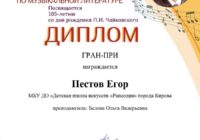 13 декабря 2025 года в Кировском колледже музыкального искусства им. И. В. Казенина состоялась Областная Олимпиада по музыкальной литературе, посвящённая 185-летию со дня рождения П. И. Чайковского. С огромной радостью сообщаем, что учащиеся нашей школы показали блестящие результаты! 🏆 Гран-при — Пестов Егор 🥇 Диплом лауреата I степени — Воробьёва Анастасия, преподаватель Белова Ольга Валерьевна.… Читать далее »